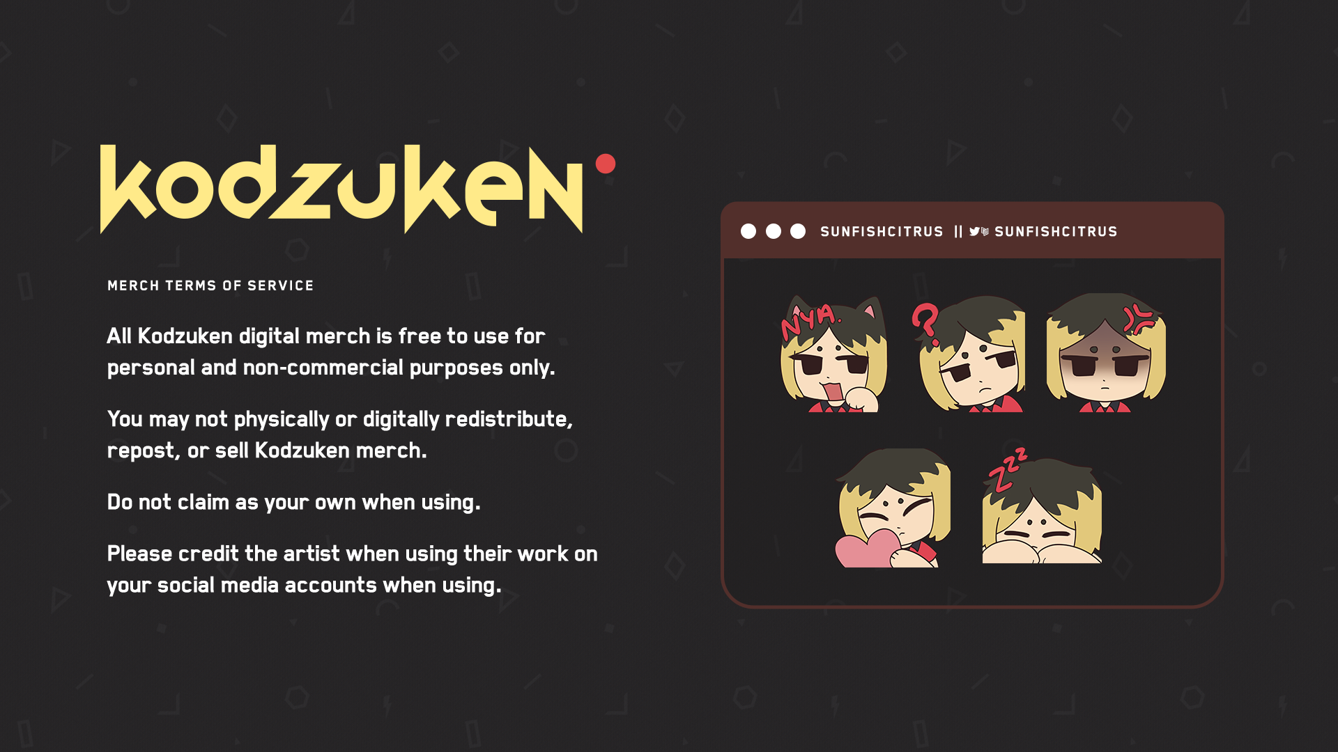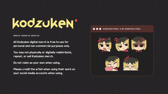 All Kodzuken digital merch are free to use for personal and non-commercial purposes only. You may not physically or digitally redistribute, repost, or sell them. All rights belong to the artists. Do not claim as your own when using. Please credit the artist when using their work on your social media accounts.